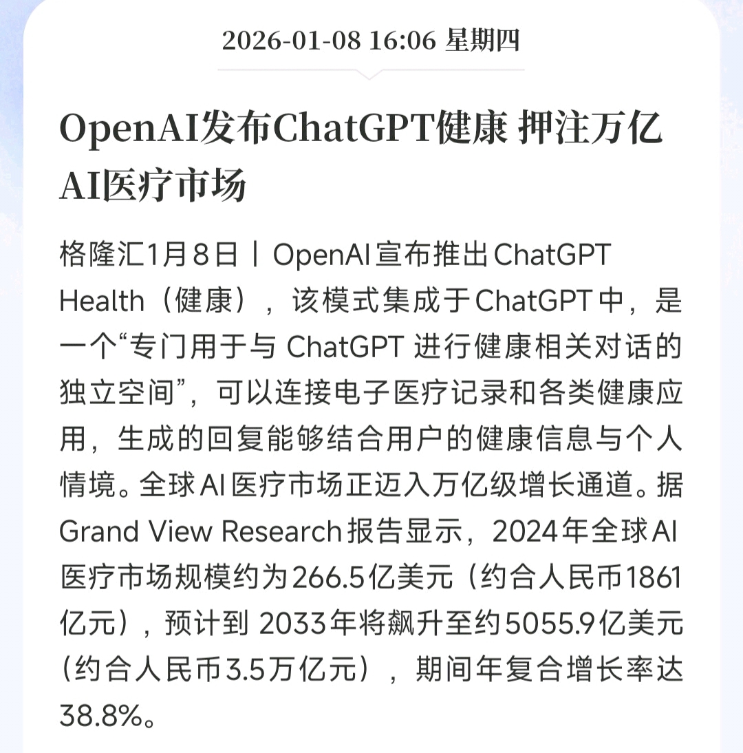 $创业慧康(SZ300451)$ OpenAI发布ChatGPT健康 押注万亿AI医疗市场。国际巨头下场了