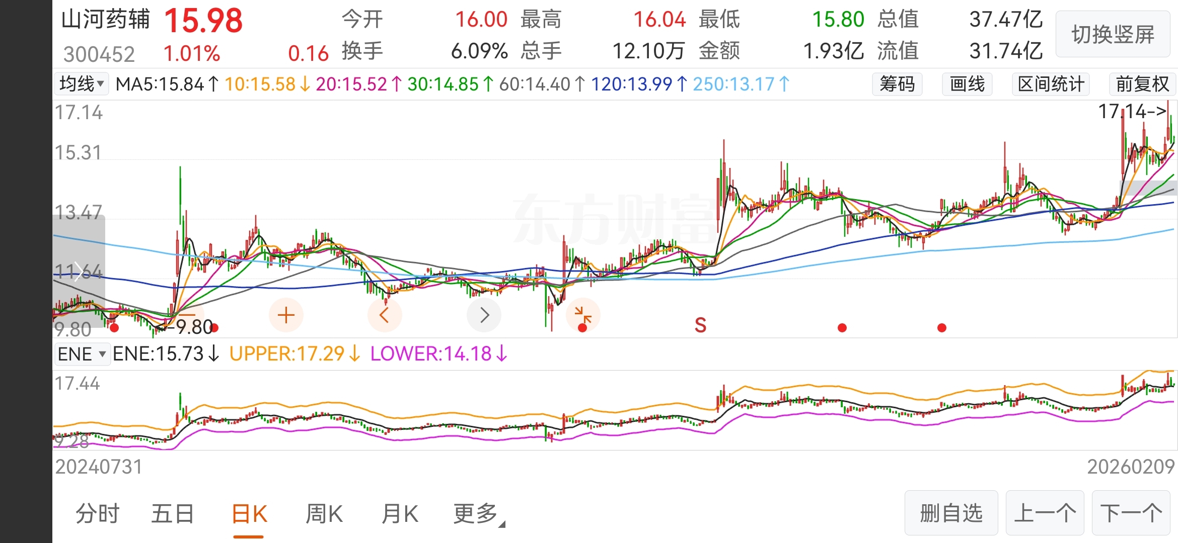 $山河药辅(SZ300452)$ 年线之上,业绩厚实,其他的不多说了
