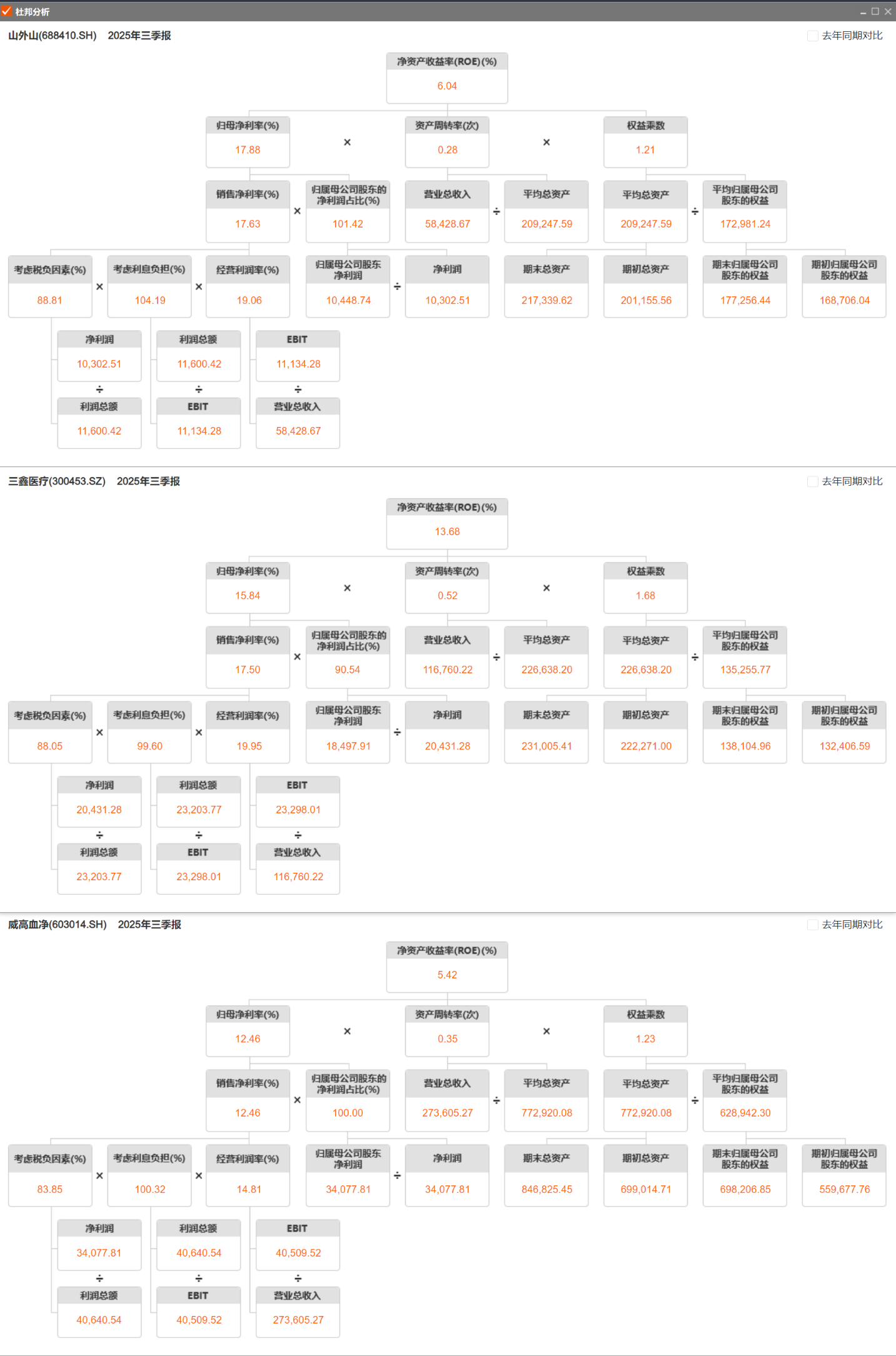 山外山、三鑫医疗、威高血净杜邦分析对比