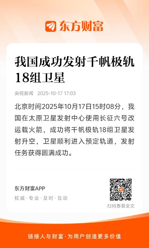 北京时间2025年10月17日15时08分,我国在太原卫星发射中心使用长征六号改运载火箭,成功将千帆极轨18组卫星发射升空,卫星顺利进入预定轨道,发射任务获得圆满成功。