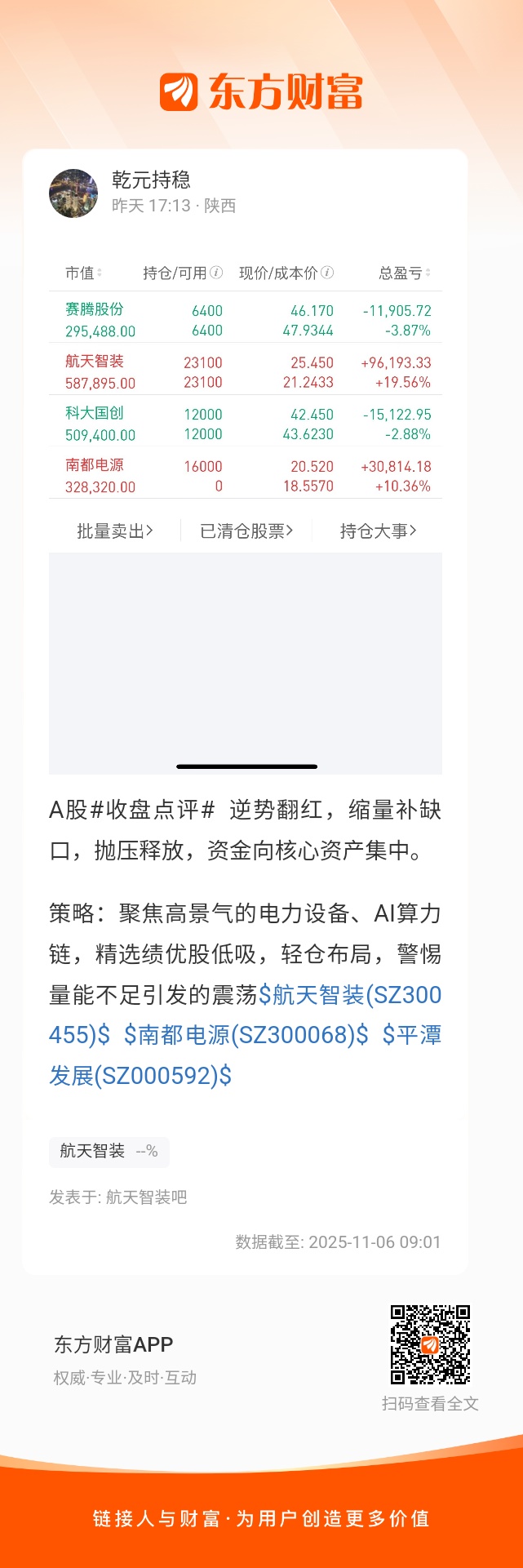 策略:聚焦高景气的电力设备、AI算力链,精选绩优股低吸,轻仓布局,警惕量能不足引发的震荡$航天智装(SZ300455)$ $南都电源(SZ300068)$ $平潭发展(SZ000592)$