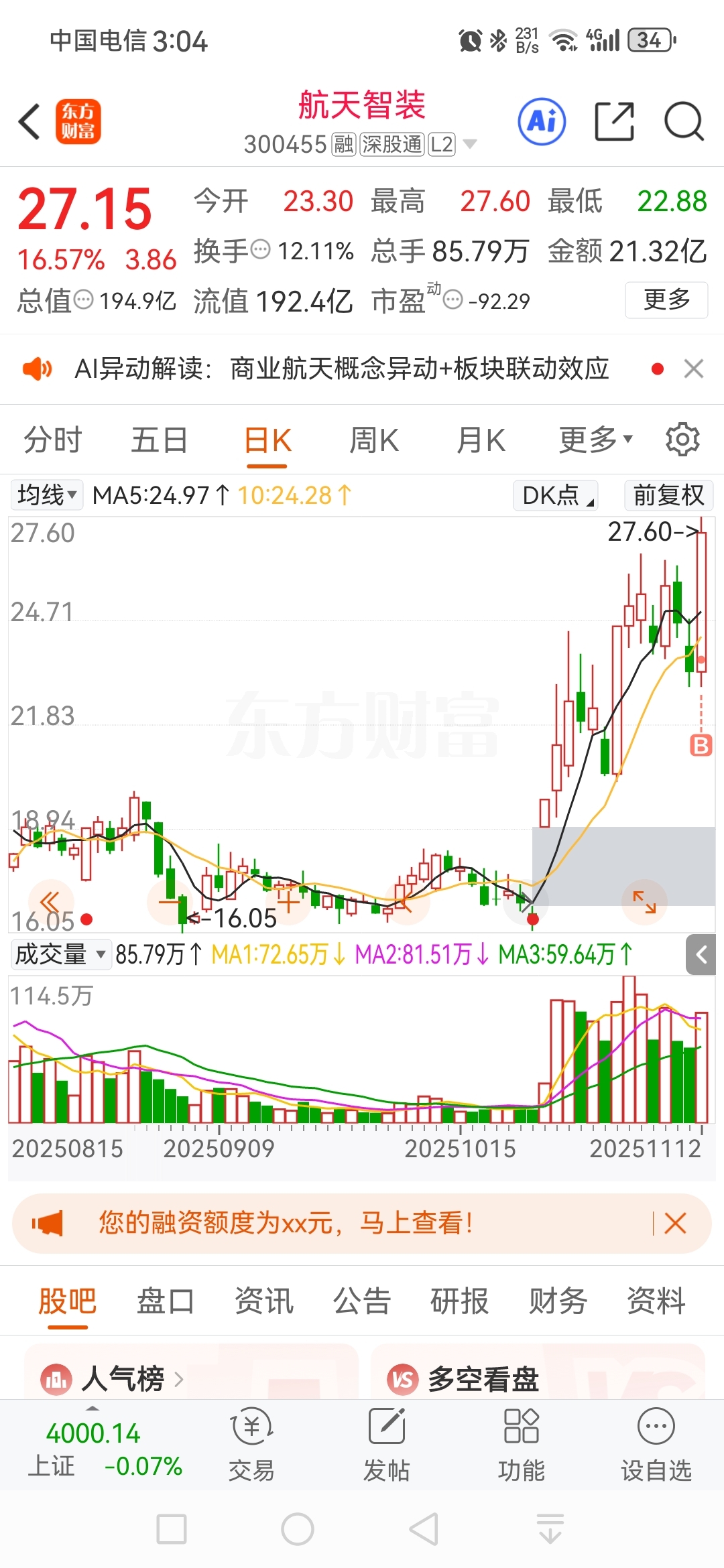 $航天智装(SZ300455)$ 盘中最大回撤4.1%,早盘有个跌停,2个-5%,一个不死不活,一个微红2%,本月盈利几乎已经回撤完了