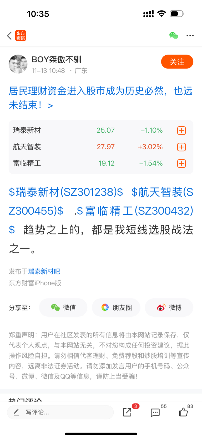 温馨提示: 1.根据《证券法》规定,禁止编造、传播虚假信息或者误导性信息,扰乱证券市场;2.用户在本社区发表的所有资料、言论等仅代表个人观点,与本网站立场无关,不对您构成任何投资建议。用户应基于自己的独立判断,自行决定证券投资并承担相应风险。《东方财富社区管理规定》