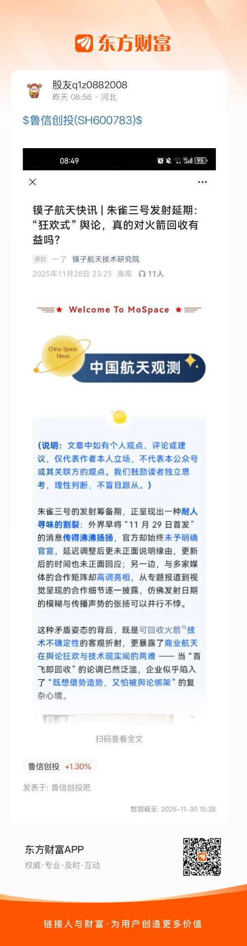 $航天智装(SZ300455)$ $上海沪工(SH603131)$ $航宇微(SZ300053)$ 这个才是客观的,朱雀3以后要走的鲁还很长,星期五很多搏29日发射的散户进来搏一把,希望落空,且后续风险很大。
