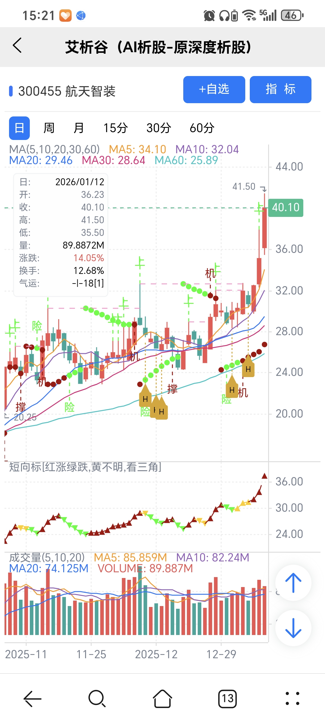 风险:股价下穿艾短波或红变绿、绿字。