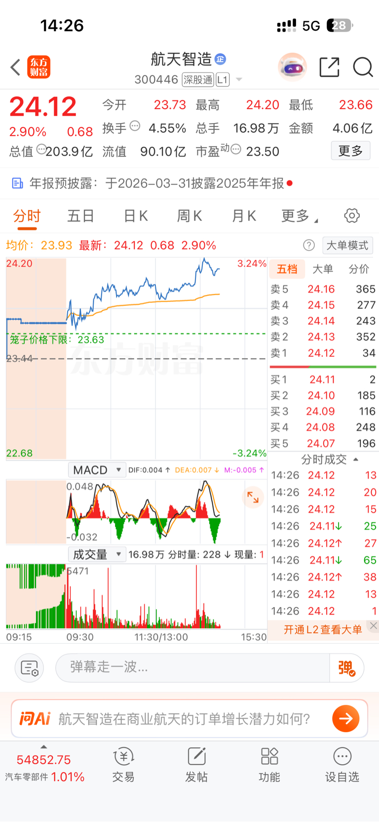 $航天智装(SZ300455)$ 虚假的航天票--航天智装:发公告说自己在航天方面有重要合作,结果在商业航天板块涨了2.5个点的时候死死压盘;真正的航天票--航天智造:公告上说这没业务,但实际走势跟着走