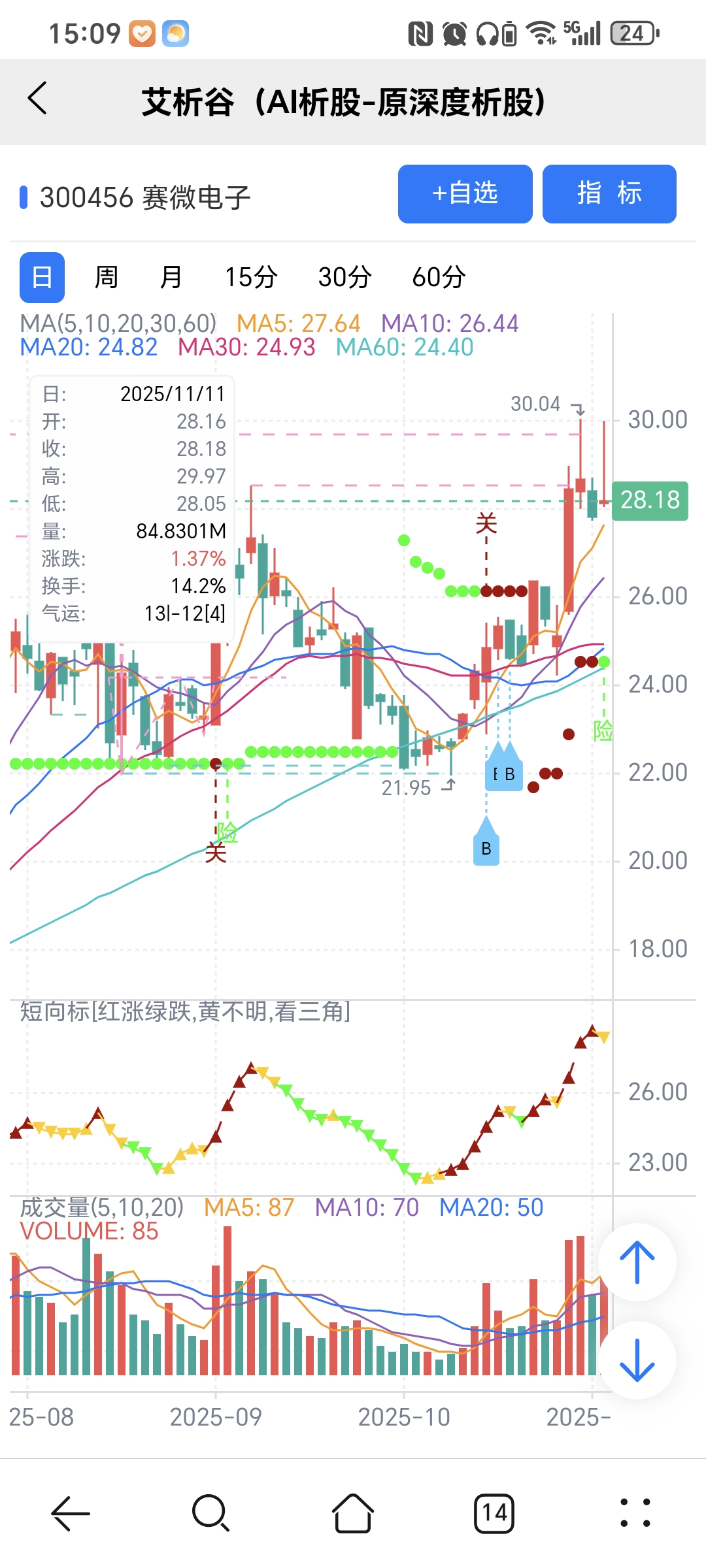 红绿小圆点是艾析谷的量化指标-超级短趋线,是趋势跟踪+突破类的量化指标,完全免费。