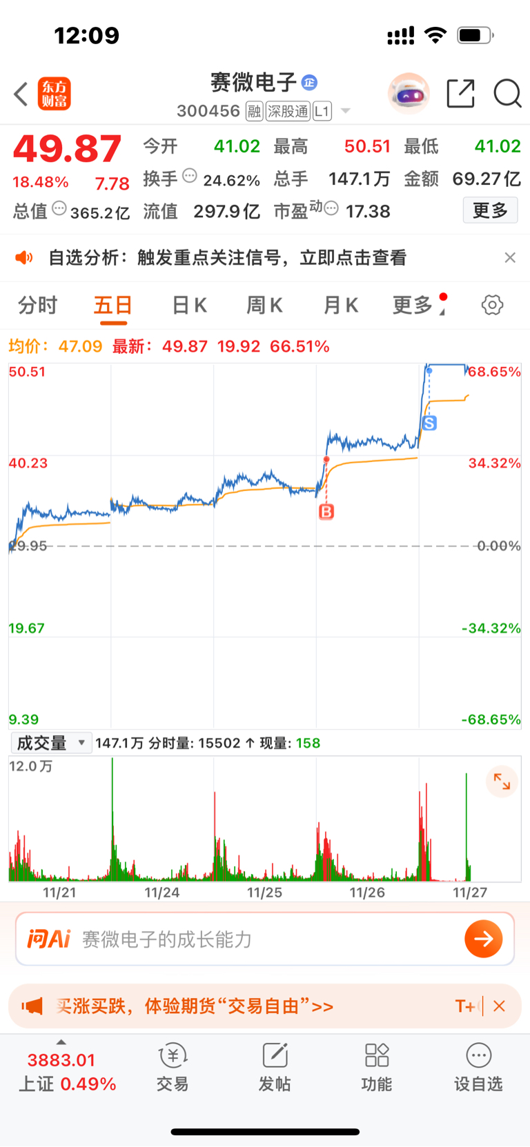 $赛微电子(SZ300456)$ 这票没有涨停板的习惯!我恐高吃了26个点先走了!等回调再回来看家人们