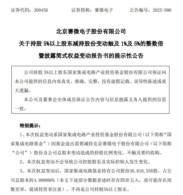 赛微电子:国家集成电路基金减持642.78万股 持股比例降至5%以下