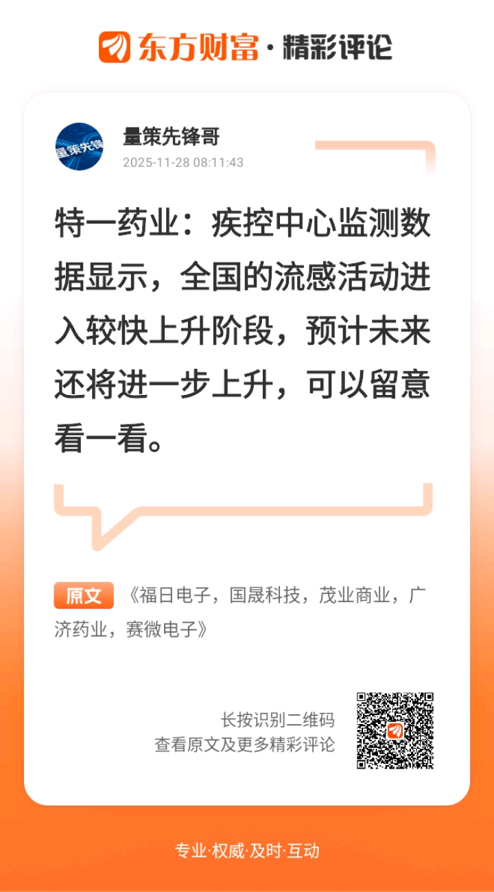 广济药业 $广济药业(SZ000952)$,最近流感高发,京东健康数据显示速福达成交额暴张14倍,英G流感也爆了,流感赛道这波热度跟钓鱼时的旺口期似的,根本停不下来。这公司生产的小儿氨酚黄那敏颗粒能缓解流感症状,正好契合市场需求,跟钓鱼时用了针对性的饵料似的,命中率高。而且公司是维生素B2全球三寡头之一,产能占比近一半,垄断优势明显,这护城河跟钓鱼时占了个鱼群必经之路似的,不愁没鱼来;实控人是湖北省G资委,G企背景靠谱;还拿到了非布司他片的注册证书,拓展了痛风治疗领域;两大保健品研发项目也完成了,正在布局销售渠道,业务多园化发展。昨天这票已经张停了,今天如果继续强势,大概率能连杆,作为钓鱼佬,这种热门赛道+优质标的,必须重点关注,不过也要注意风险,别追高站岗。