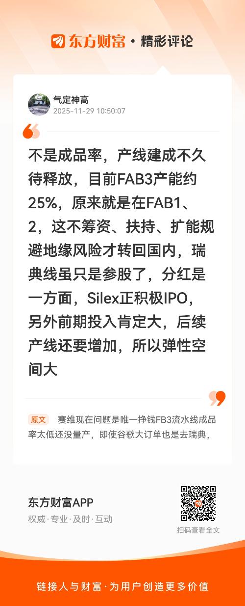 不是成品率,产线建成不久待释放,目前FAB3产能约25%,原来就是在FAB1、2,这不筹资、扶持、扩能规避地缘风险才转回国内,瑞典线虽只是参股了,分红是一方面,Silex正积极IPO,另外前期投入肯定大,后续产线还要增加,所以弹性空间大 我在《赛维现在问题是唯一挣钱FB3流水线成品率太低还没量产,即使谷歌大订单也是去瑞典,》的评论获得了大家的关注。