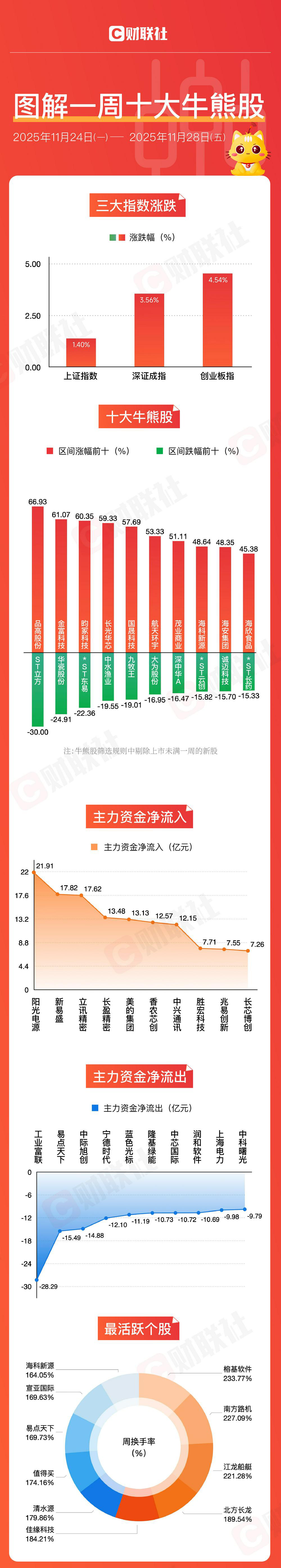 财联社11月30日讯,本周A股三大指数反弹拉升,其中上证指数周涨1.40%,深成指周涨3.56%,创业板指周涨4.54%。本周通信设备、教育、半导体、电池板块涨幅居前,CPO、铜缆高速连接、AI应用、商业航天概念股表现活跃。