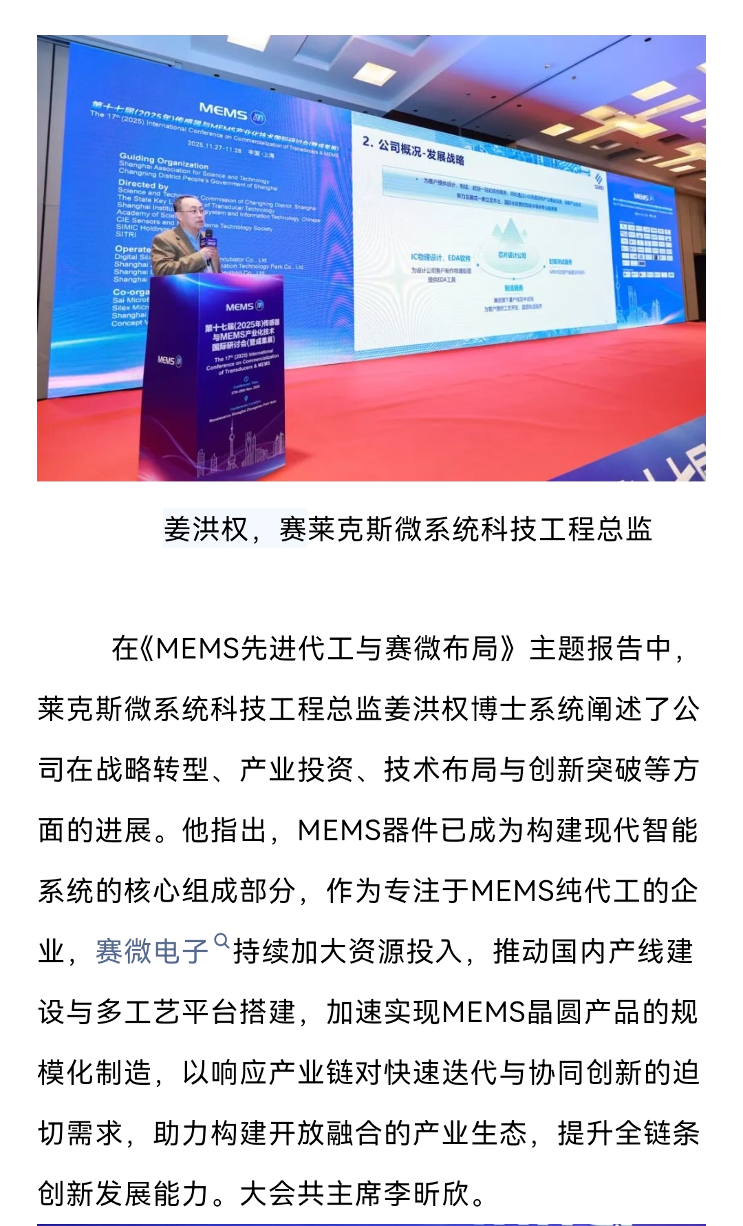 $赛微电子(SZ300456)$ 由北京赛微电子股份有限公司、赛莱克斯微系统科技(北京)有限公司、上海集成电路应用创新概念验证中心协办的“第十七届(2025年)传感器与MEMS产业化技术国际研讨会(暨成果展)”在上海龙之梦万丽酒店成功召开。