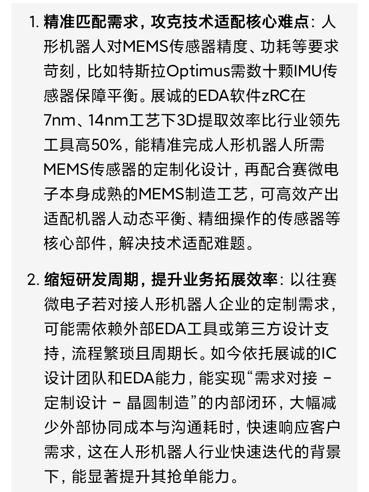 看好赛微电子在控股子公司青岛展诚助力下,快速拓展人形机器人领域的业务。
