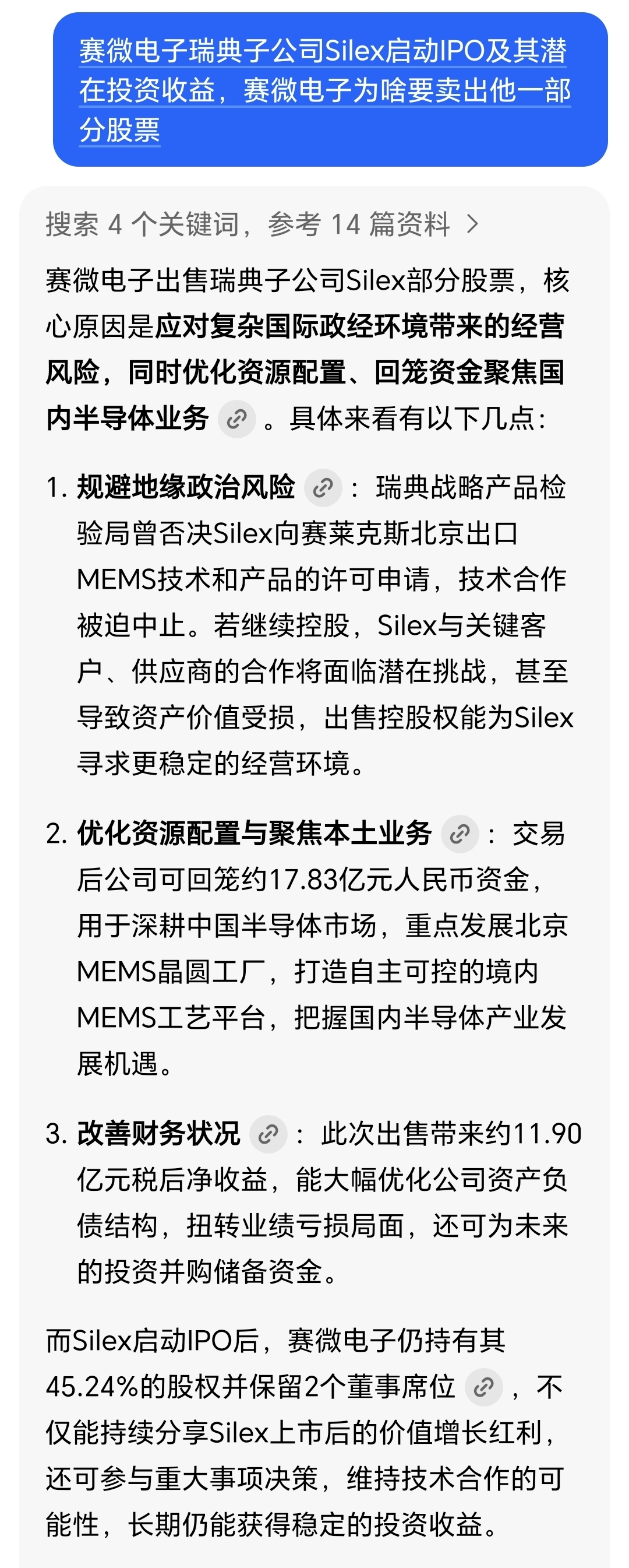 $赛微电子(SZ300456)$ 赛微电子为啥最近卖出一部分瑞典子公司股票?