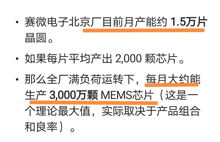赛微电子北京厂目前产能1.5万片8英寸每月,2026年达到3万片产能。每片可以做