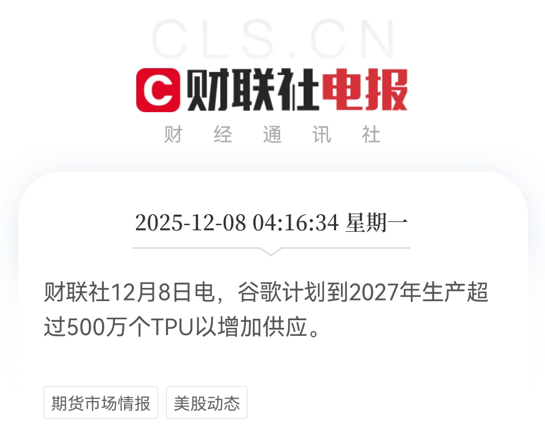 $赛微电子(SZ300456)$ 2025年12月8日(与这条快讯同天),DoNews等媒体已报道谷歌计划到2027年生产超500万个TPU;同时摩根士丹利的最新研报也将谷歌2027年TPU产量预测从300万块上调至500万块(增幅67%),核心是为了满足AI算力需求、提升谷歌云竞争力。