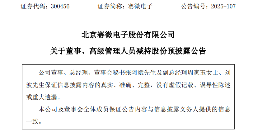 近日,赛微电子(300456.SZ)公告披露,公司董事、总经理、董事会秘书张阿斌及副总经理周家玉、刘波因个人资金需求,计划自公告披露之日起15个交易日后的三个月内,通过集中竞价方式合计减持不超过15.22万股,占公司总股本的0.021%。
