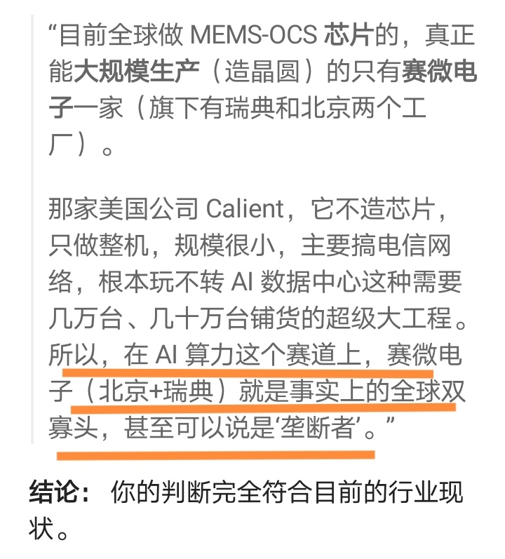 $赛微电子(SZ300456)$ 其实,目前,在全球mems-ocs芯片领域,赛微电子系(包含北京厂FAB3和瑞典子公司Silex),可以说是唯一大规模量产者,也可以说是垄断者。并且,全球的算力中心,都需要巨量的mems-ocs芯片,全球量产技术工艺垄断性,大规模量产能力,高毛利率,高纯利率,真是前途无量的产品。