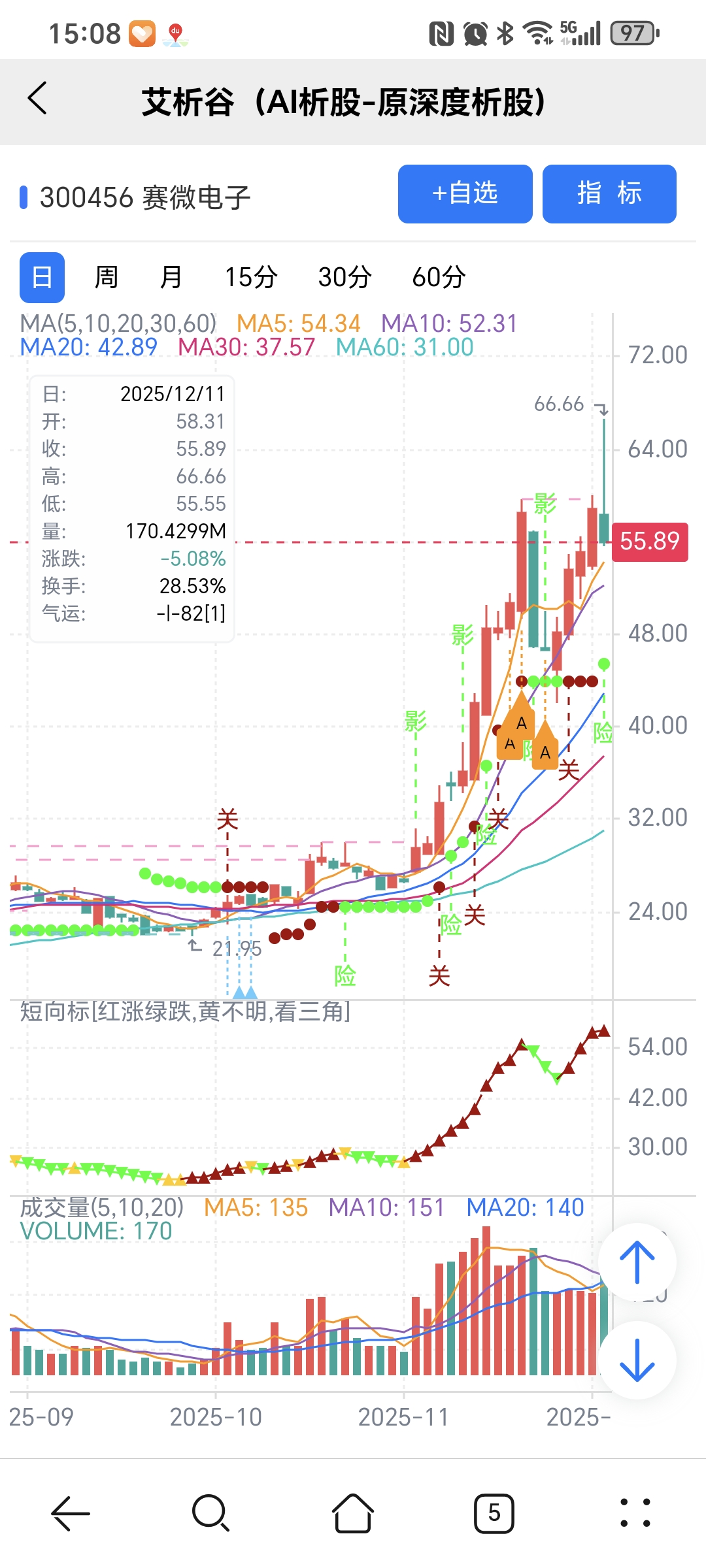 红绿小圆点是艾析谷的量化指标-超级短趋线,是趋势跟踪+突破类的量化指标,完全免费。