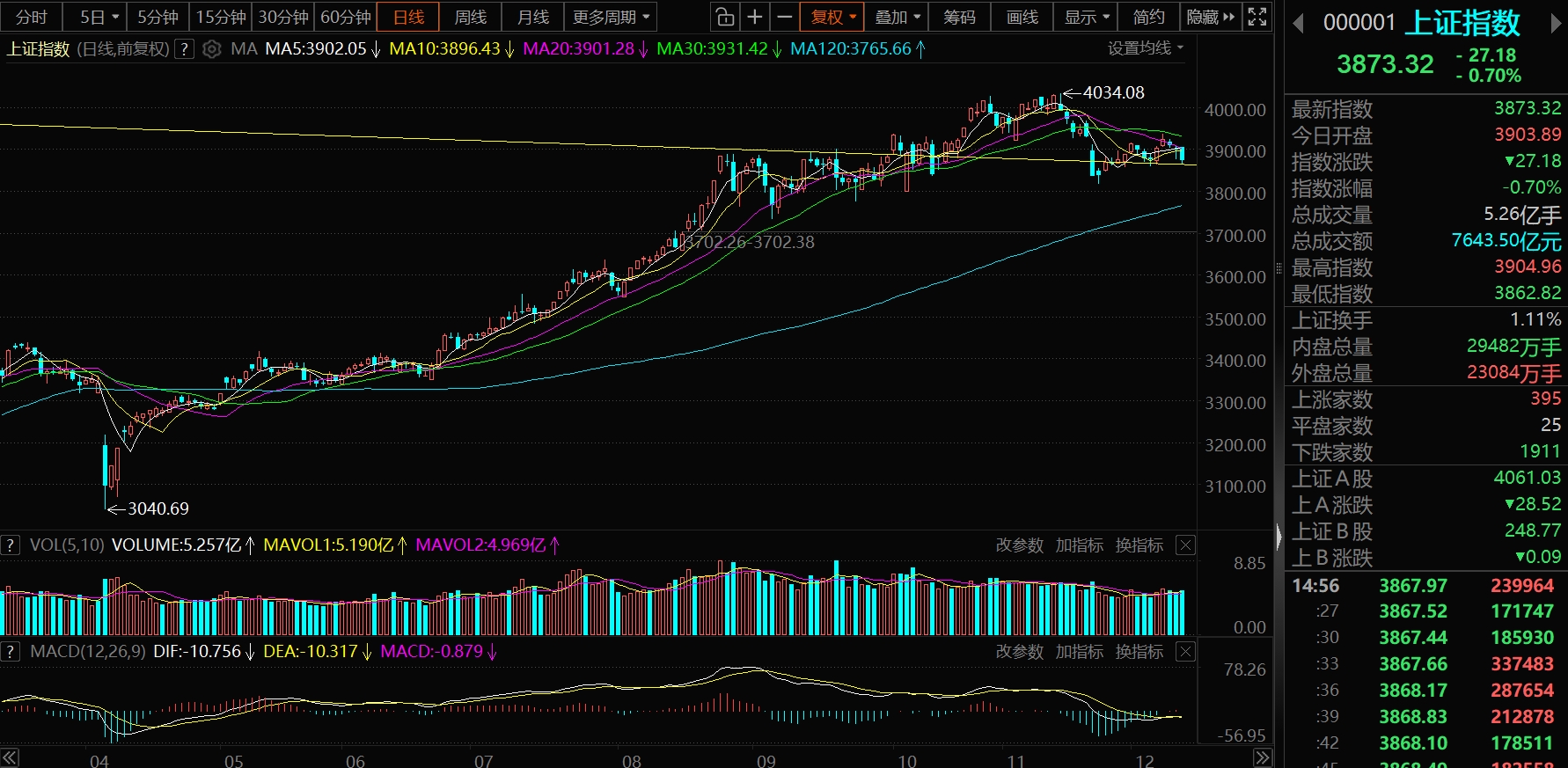 大盘继续回调,沪指将考验3850点的支撑,成交量比昨天放量900多亿。