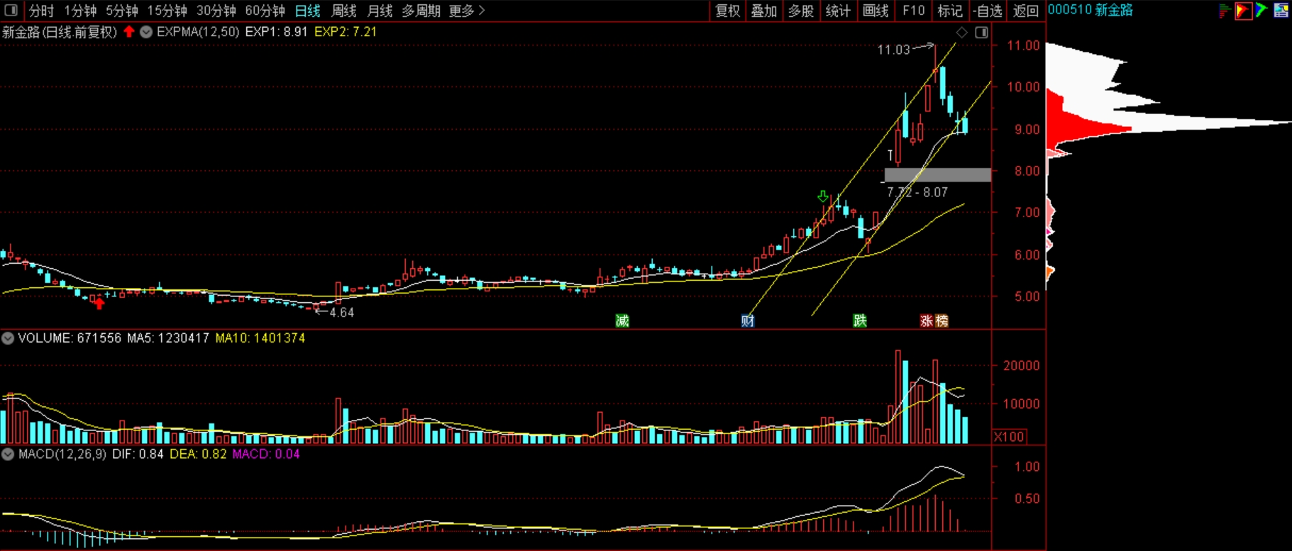 新金路,调整4个交易日了,测算在8.8元~9元应该有反弹要求,今天尾盘8.88元建仓,博弈反弹!