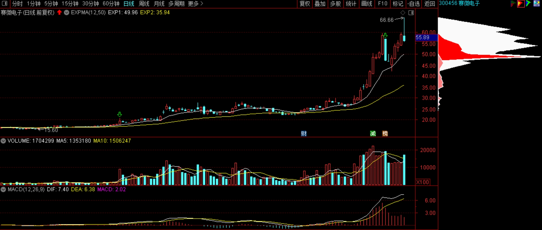 $赛微电子(SZ300456)$ 赛微电子,今天最高点位66.66元,这价位可牛X了,难道是大对子顶?之后大幅回落开始埋人,收盘下跌!曾经在该股一日游收获19个点利润,但卖飞了,今天这根K线往后怎么走,谁也不知道,但足以引起高度重视,有合适买点我会再回来的!