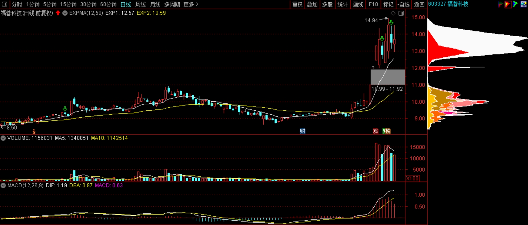 $福蓉科技(SH603327)$ 福蓉科技,已经持有该股有一段时间了,每天有机会就做T!今天该股上午大幅拉升,但量能不济,队友纷纷掉队,中兴通讯,道明光学跌停,最终拖累该股回落!趋势还在,做T格局!