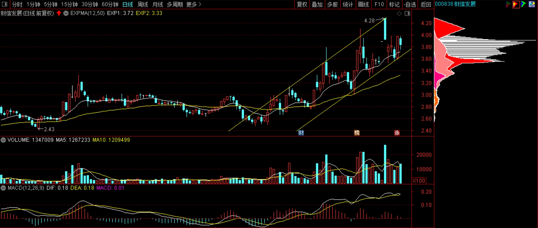 财信发展,昨天涨停,今天没给溢价,但股价走势尚可,上升通道运行中,走趋势的股票,持仓格局了!