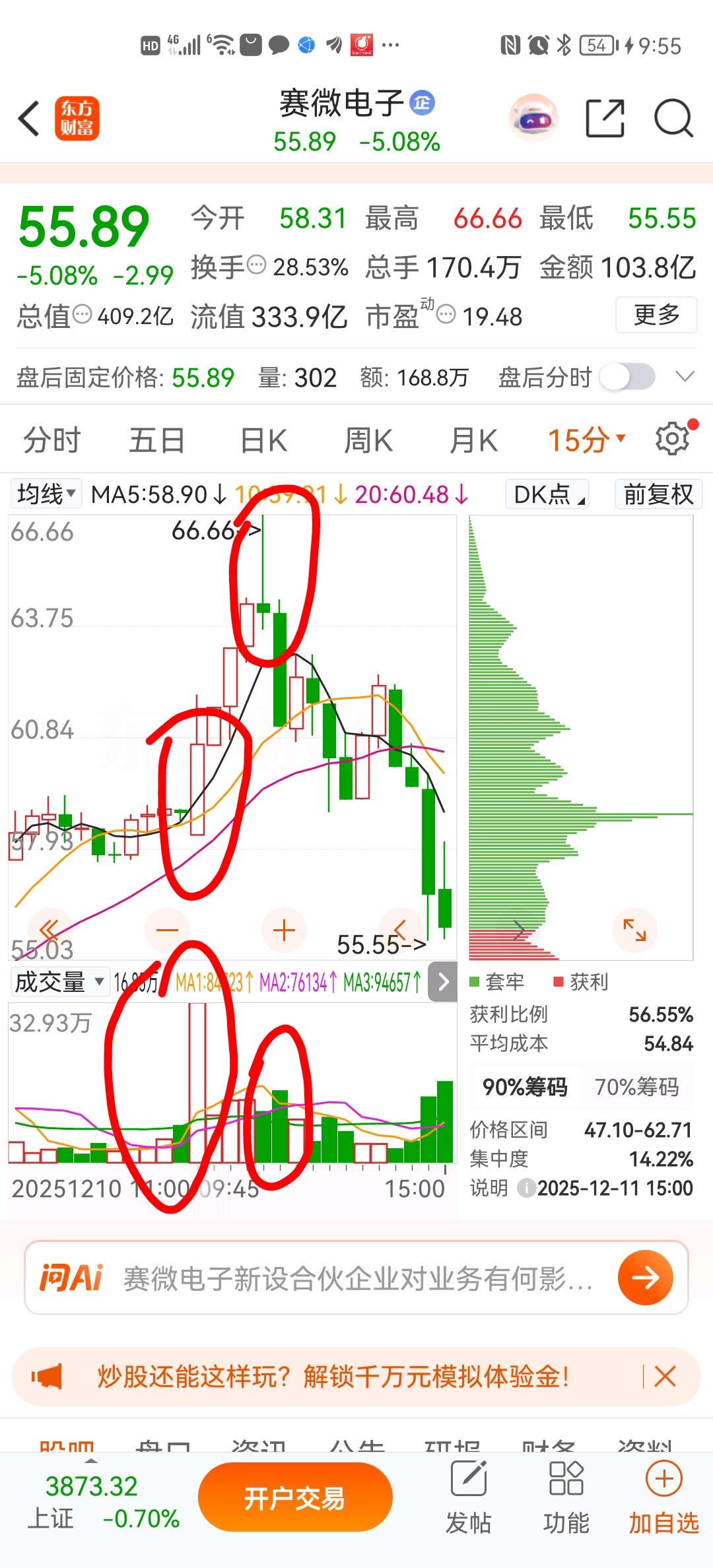 $赛微电子(SZ300456)$ 今天开盘15分钟放量拉伸,可见主力是有意往上的。拉到最高66.6并没有放量,说明此处并不是大顶,奈何大盘太差,顺势洗盘,作为全球绝对领先的mems-ocs芯片公司,大家都知道是会下金蛋的鸡,没点力度洗盘效果达不到,所以大家不必恐慌,明天急跌就加仓方为上策,跟上周如出一辙,上周43.3急杀时买到了好的筹码。