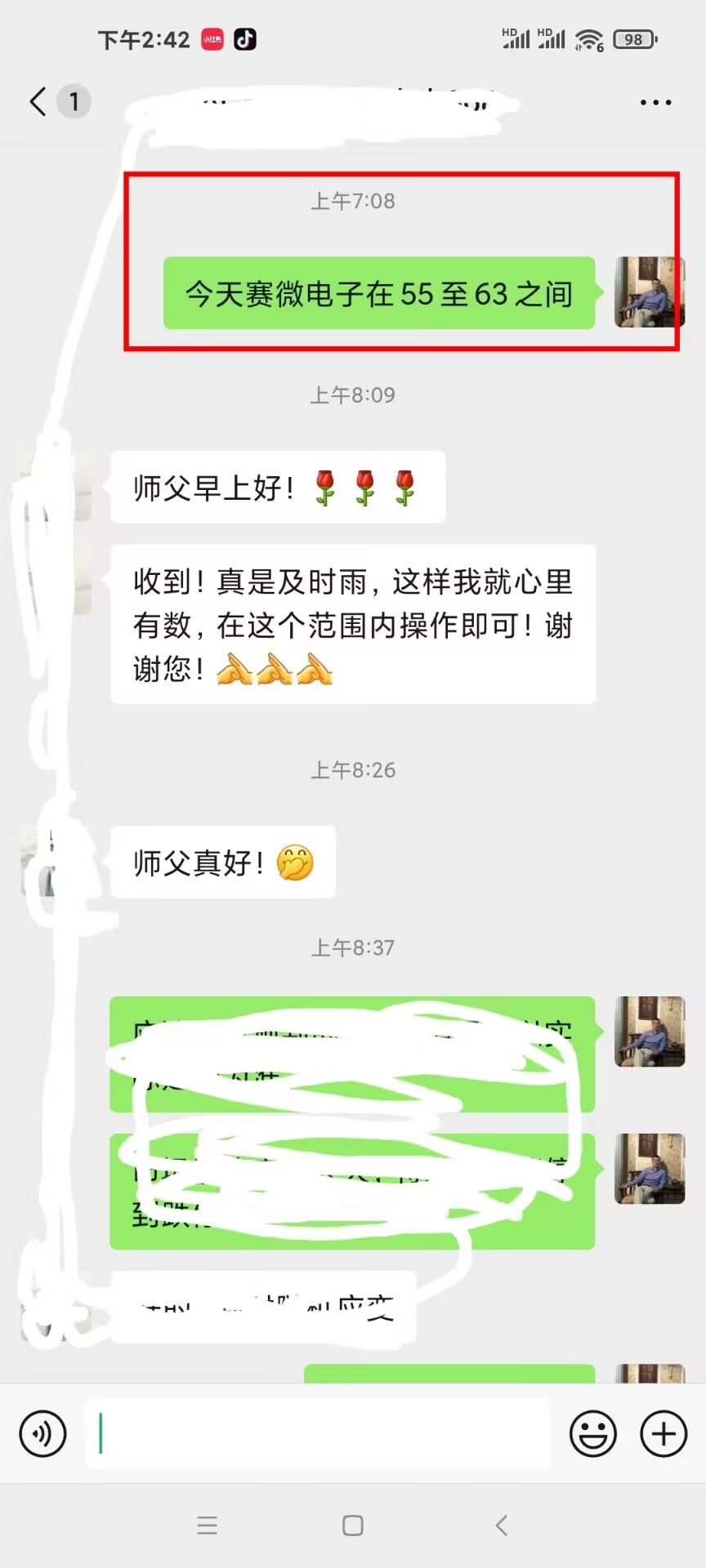 早盘告诉徒弟“今天赛微电子在55至63之间”(上图红框时间7.08分)
