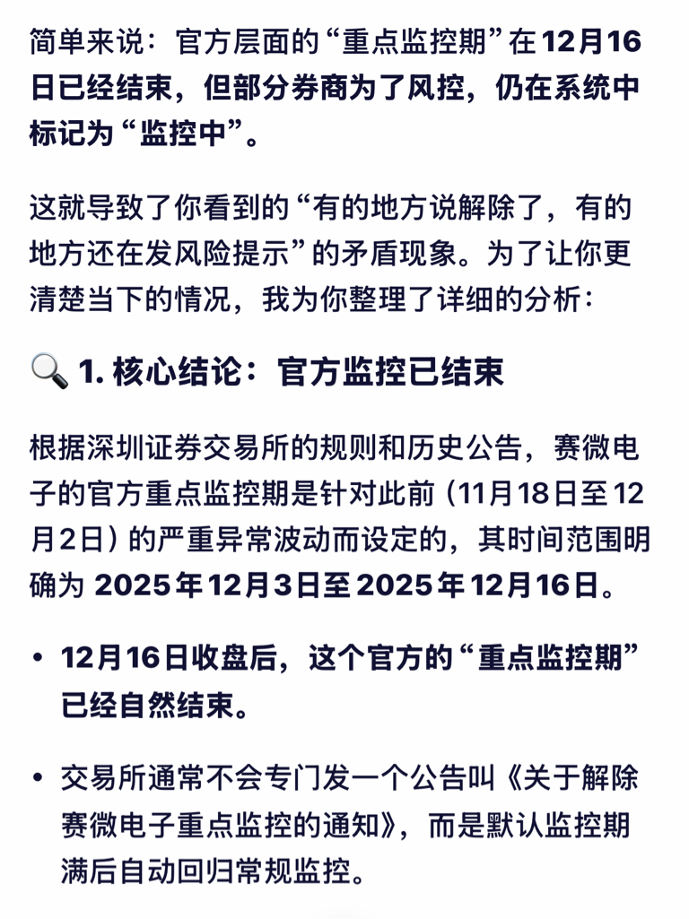 如果交易所的监控期已在16号结束,为何股吧里有股友,证实收到多家券商发短信或交易时跳出弹窗告知,赛微电子监控期再延一次至30号。信息很混乱,不知何因和真假?