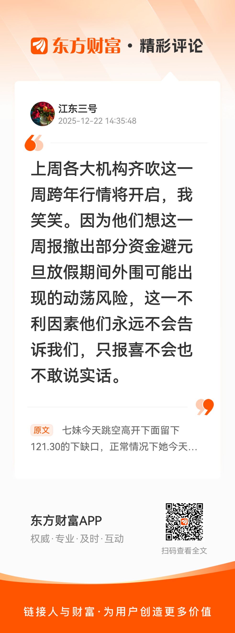 上周各大机构齐吹这一周跨年行情将开启,我笑笑。因为他们想这一周报撤出部分资金避元旦放假期间外围可能出现的动荡风险,这一不利因素他们永远不会告诉我们,只报喜不会也不敢说实话。 我在《七妹今天跳空高开下面留下121.30的下缺口,正常情况下她今天会补这个缺口,如果》的评论获得了大家的关注。