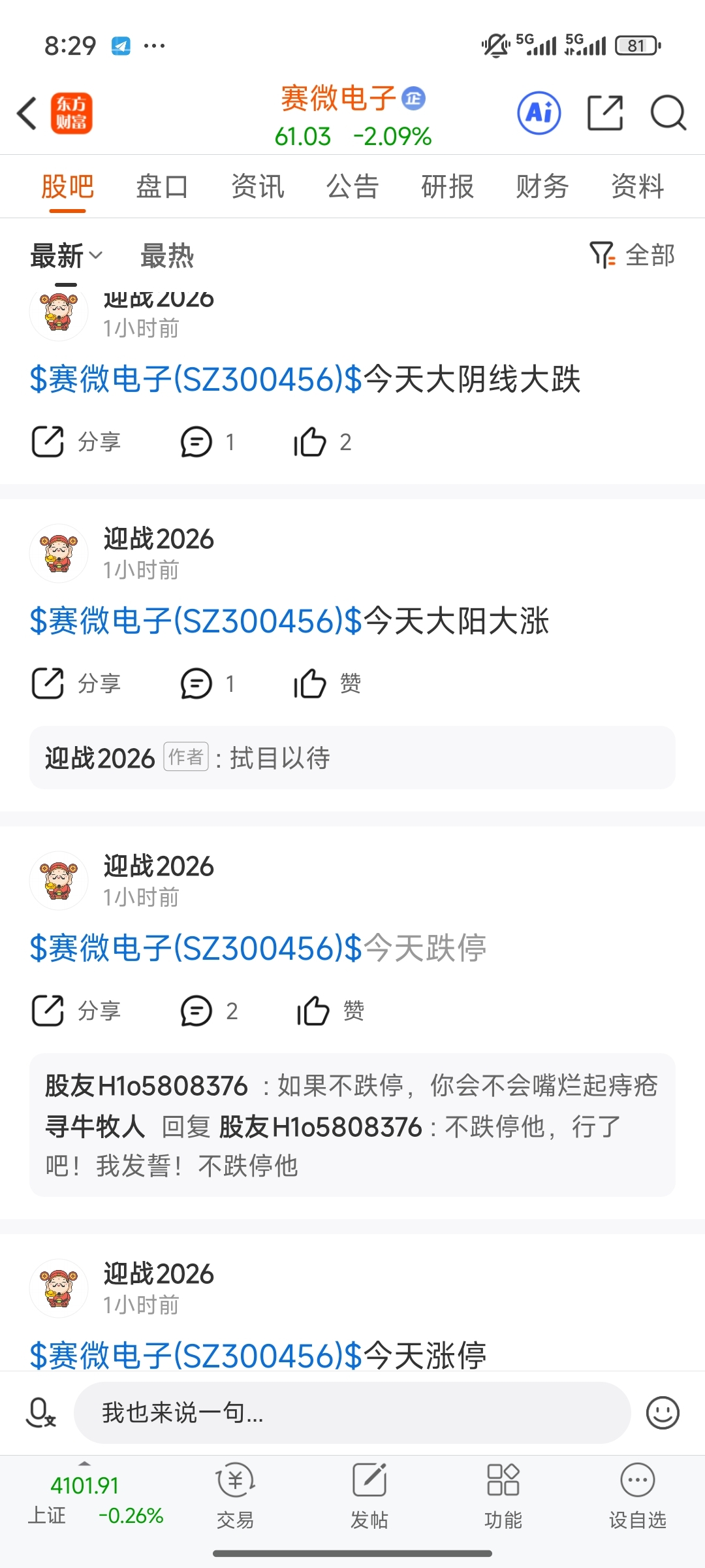 温馨提示: 1.根据《证券法》规定,禁止编造、传播虚假信息或者误导性信息,扰乱证券市场;2.用户在本社区发表的所有资料、言论等仅代表个人观点,与本网站立场无关,不对您构成任何投资建议。用户应基于自己的独立判断,自行决定证券投资并承担相应风险。《东方财富社区管理规定》