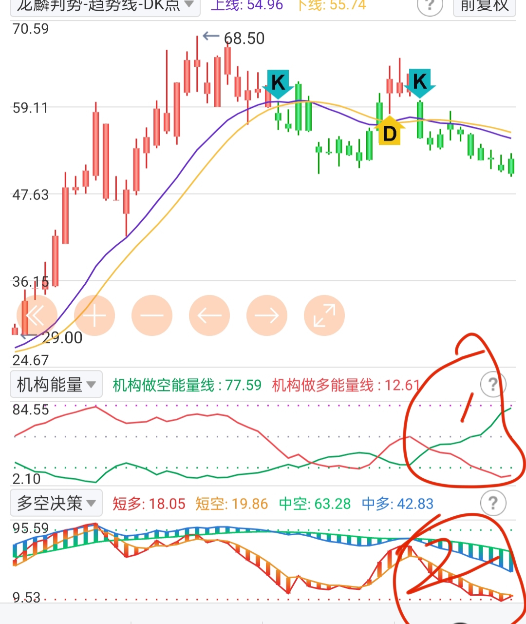 如图1:机构能量虽然做多今天有资金进场,但做空动能也持续放大。方向依旧不明确。图2:短多交叉上扬,中长却放开。综合结论:赛微下周一还有水下,但还是有红,把今天的上涨最终定义为:反抽!目标维持56元。至于反弹新高,路遥遥!
