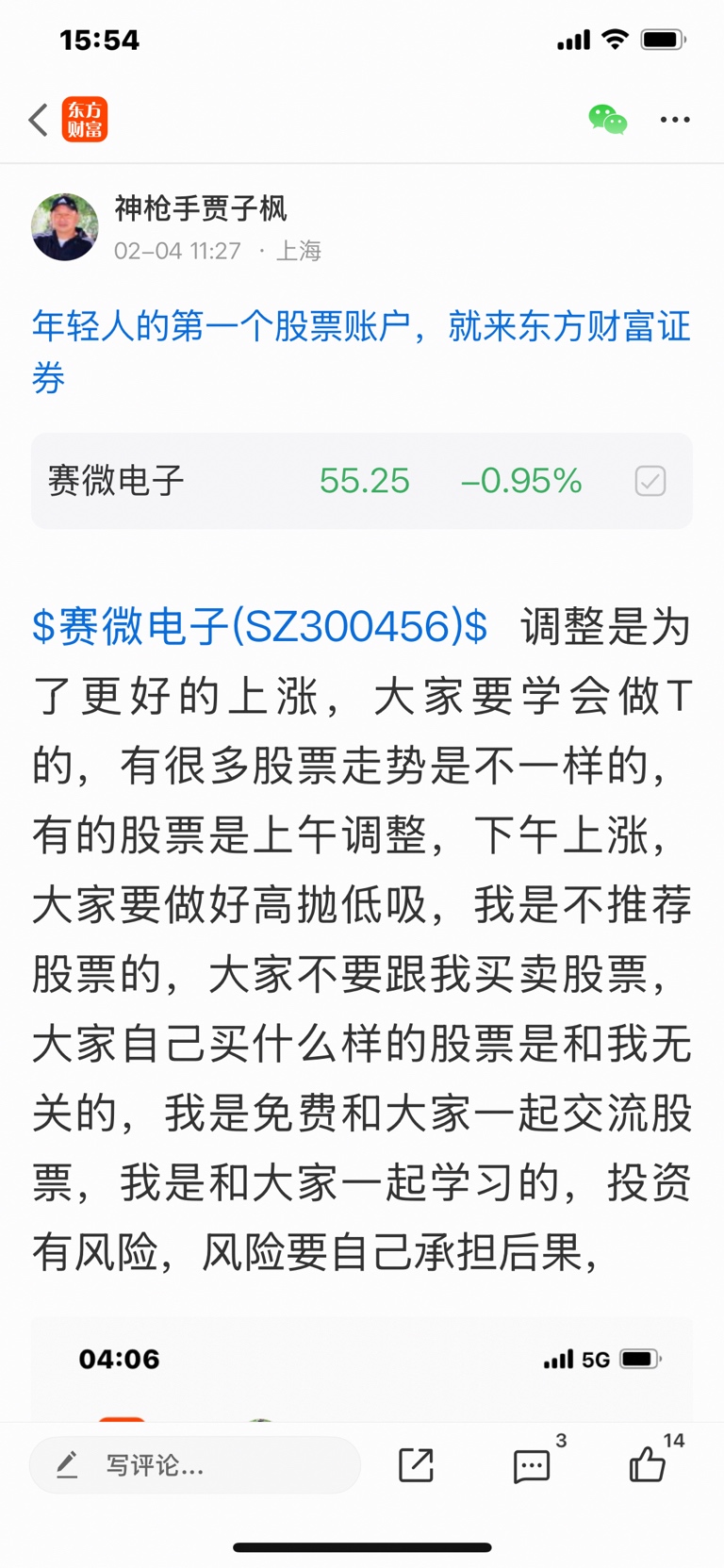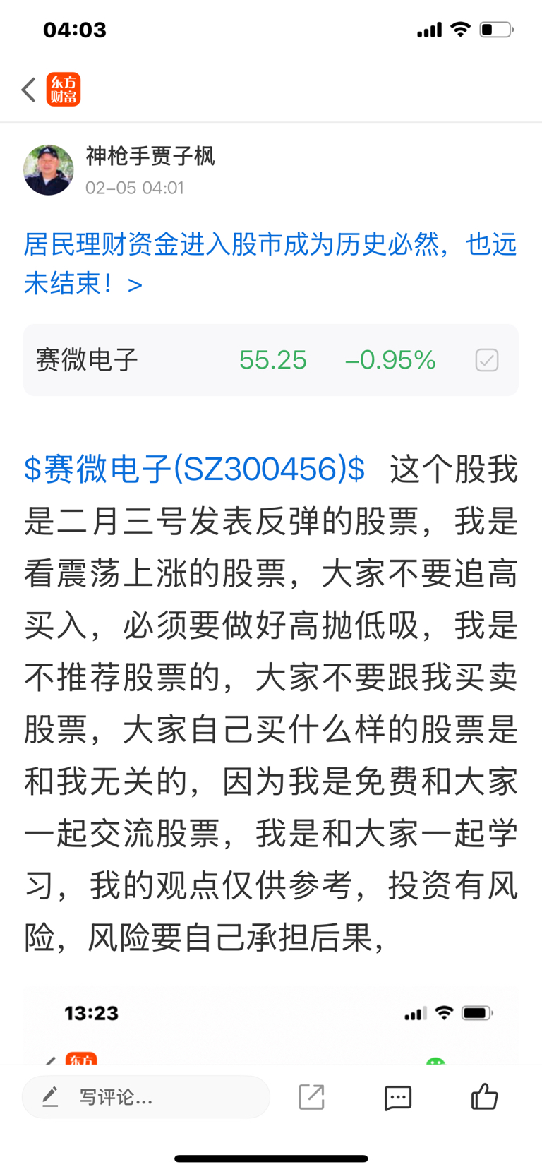 $赛微电子(SZ300456)$ 这个股是我二月三号发表文章看反弹的股票,这个股以是反转的股票,大家不要追高买入,必须要做好高抛低吸,我是不推荐股票的,大家不要跟我买卖股票,大家自己买什么样的股票是和我无关的,因为我是免费和大家一起交流股票,我是和大家一起学习的,我的观点仅供参考,投资有风险,风险要自己承担后果,