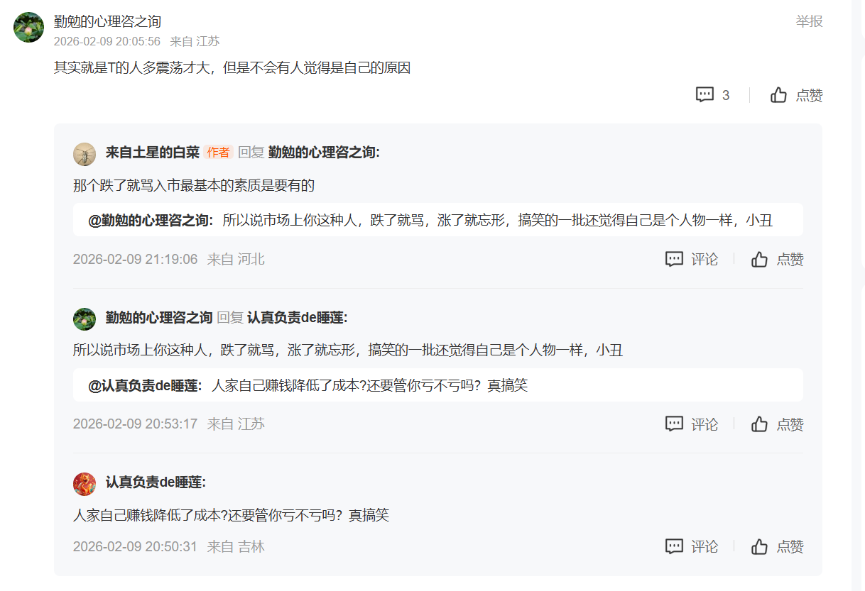 “勤勉的心理咨之询” 这种人是真的见呐! 人家高抛低吸做T 多赚了钱降低了成本,他在那里说什么股价因为做T导致的回落。啥逻辑?为了你才炒股,你赚了钱能分给别人,但凡打到了你的成本线怕是跑的比谁都快,真是小人