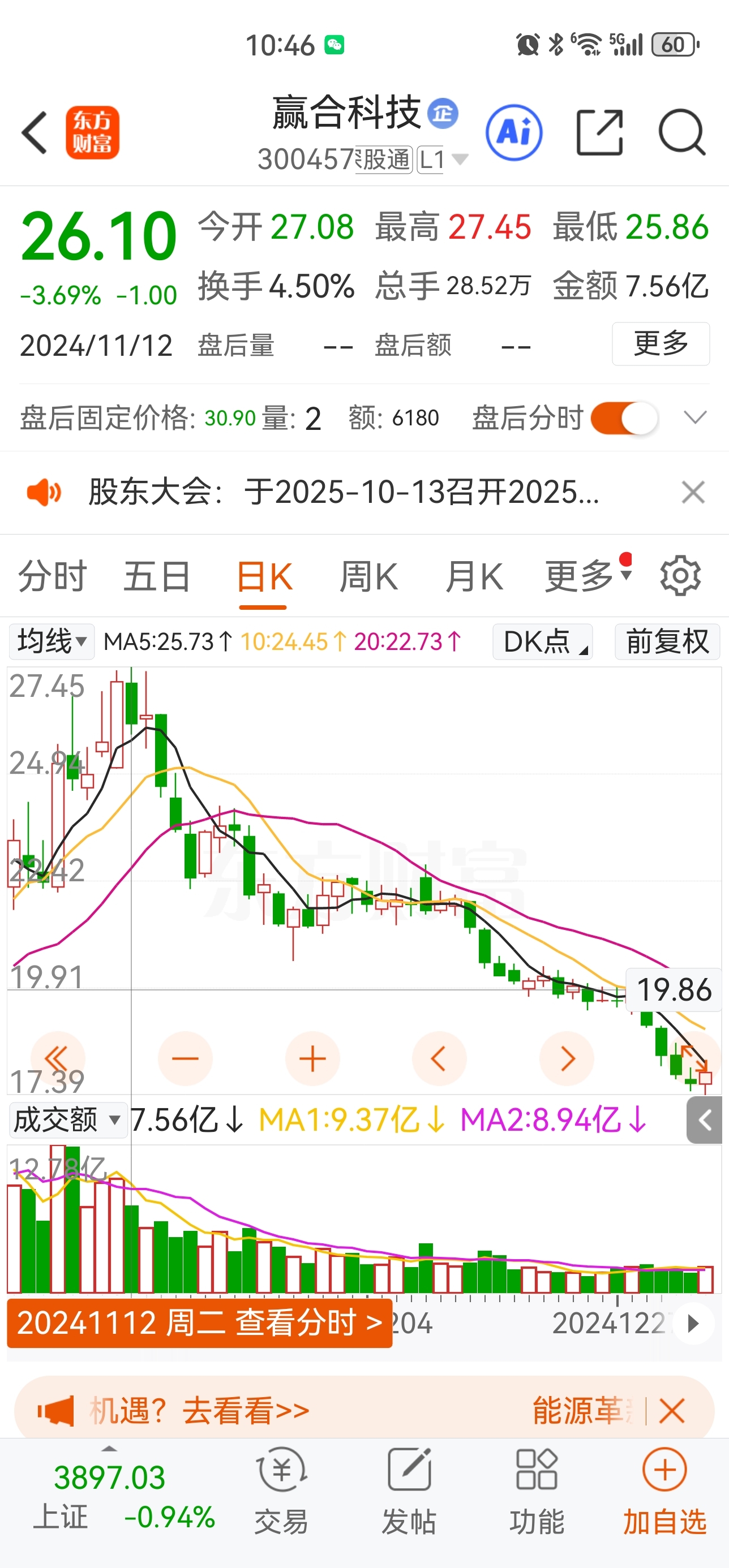 $赢合科技(SZ300457)$ 缓涨急跌是常态