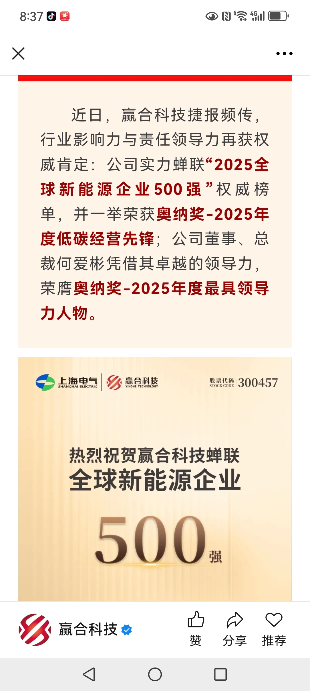 $赢合科技(SZ300457)$ 赢合科技蝉联全球新能源500强并荣膺双项奥纳大奖
