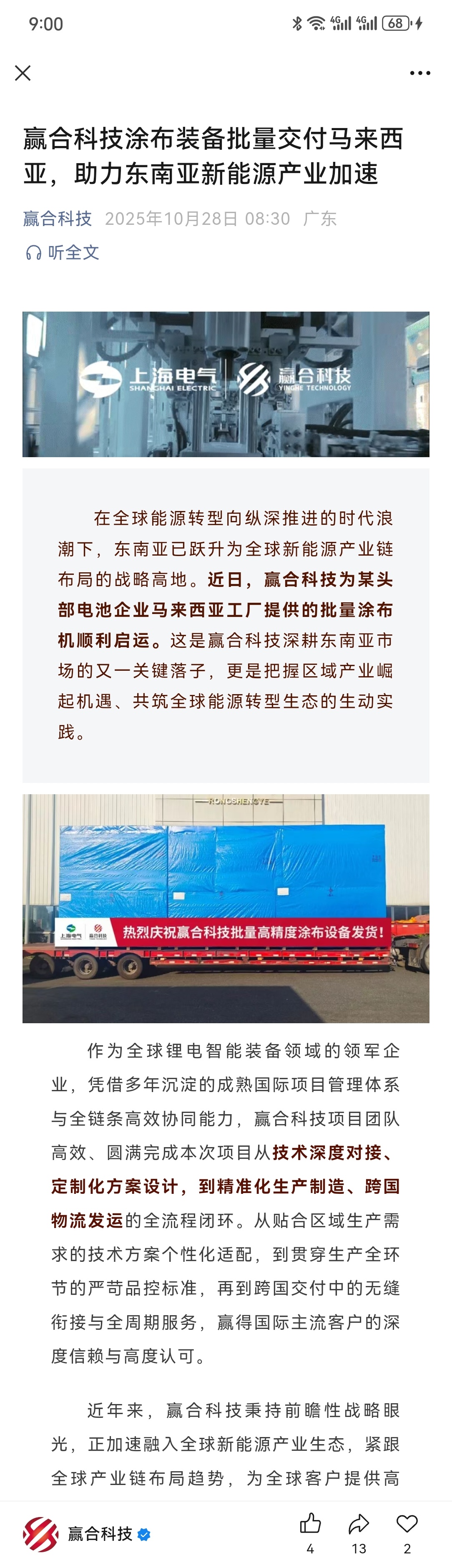 $赢合科技(SZ300457)$ 赢合科技批量交付马来西亚的涂布装备,其合作厂家为三星SDI。