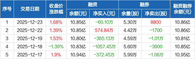 赢合科技:融资净偿还60.1万元,融资余额10.85亿元(12-23)