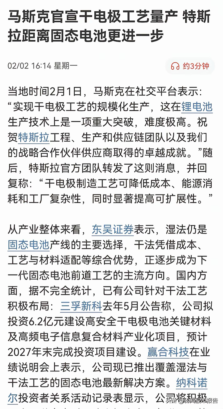 干电极技术虽非新概念,但长期受困于规模化生产。2026年2月,特斯拉宣布其基于Maxwell专利的干电极技术已在德州超级工厂实现稳定量产,被视为行业的重大突破,并与4680大圆柱电池结合以降低成本。 目前,宁德时代、赢合科技等公司也在积极布局该领域。