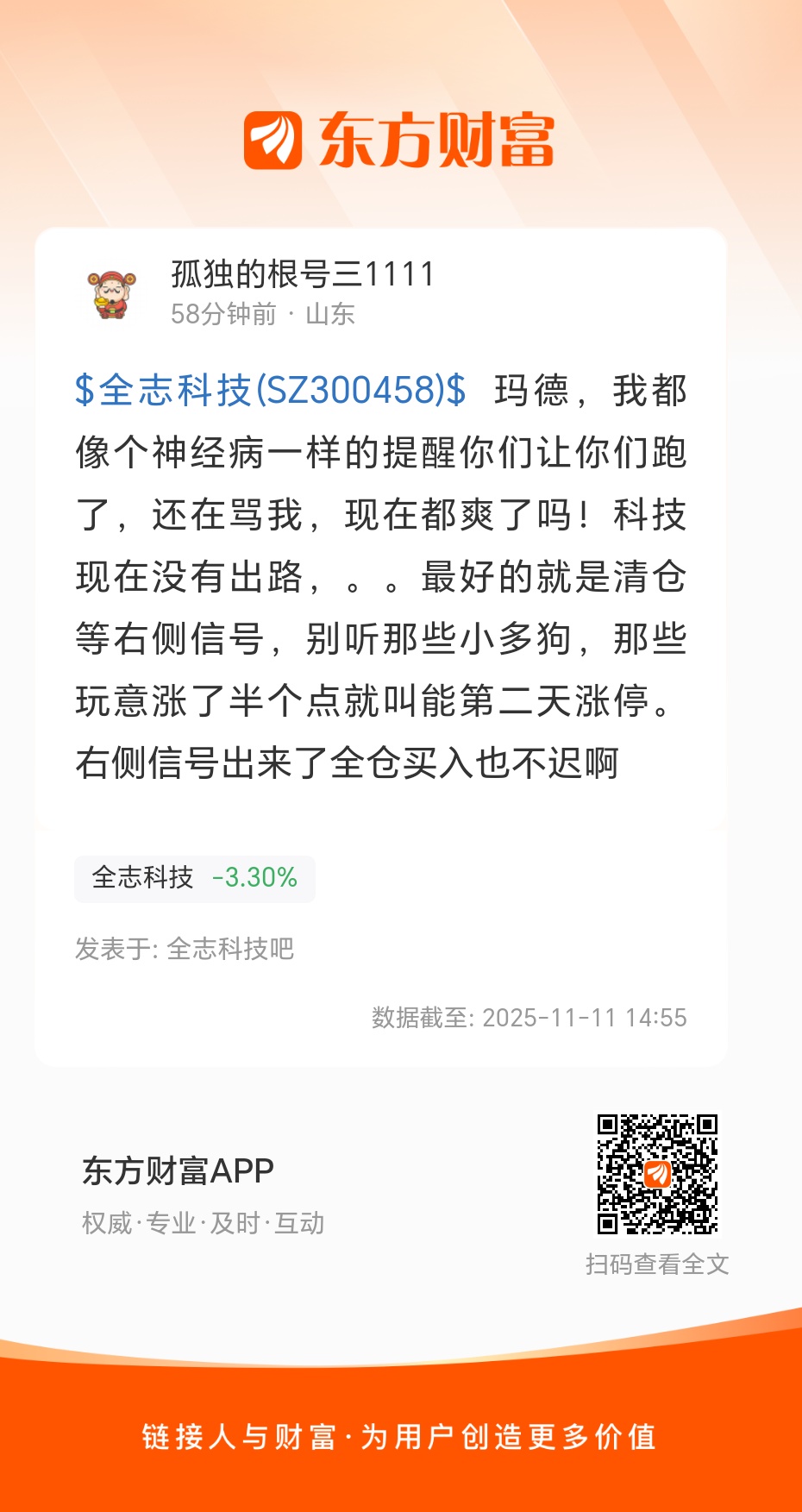 $全志科技(SZ300458)$ 玛德,我都像个神经病一样的提醒你们让你们跑了,还在骂我,现在都爽了吗!科技现在没有出路,。。最好的就是清仓等右侧信号,别听那些小多狗,那些玩意涨了半个点就叫能第二天涨停。右侧信号出来了全仓买入也不迟啊