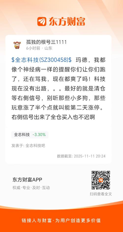 $全志科技(SZ300458)$  玛德,我都像个神经病一样的提醒你们让你们跑了,还在骂我,现在都爽了吗!科技现在没有出路,。。最好的就是清仓等右侧信号,别听那些小多狗,那些玩意涨了半个点就叫能第二天涨停。右侧信号出来了全仓买入也不迟啊