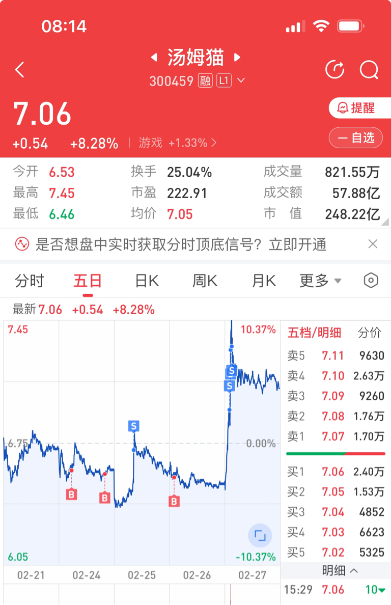 $汤姆猫(SZ300459)$ 昨天按耐不住,卖了!事后又特别后悔,昨晚忐忑不安!今天涨停了,我只能看戏了