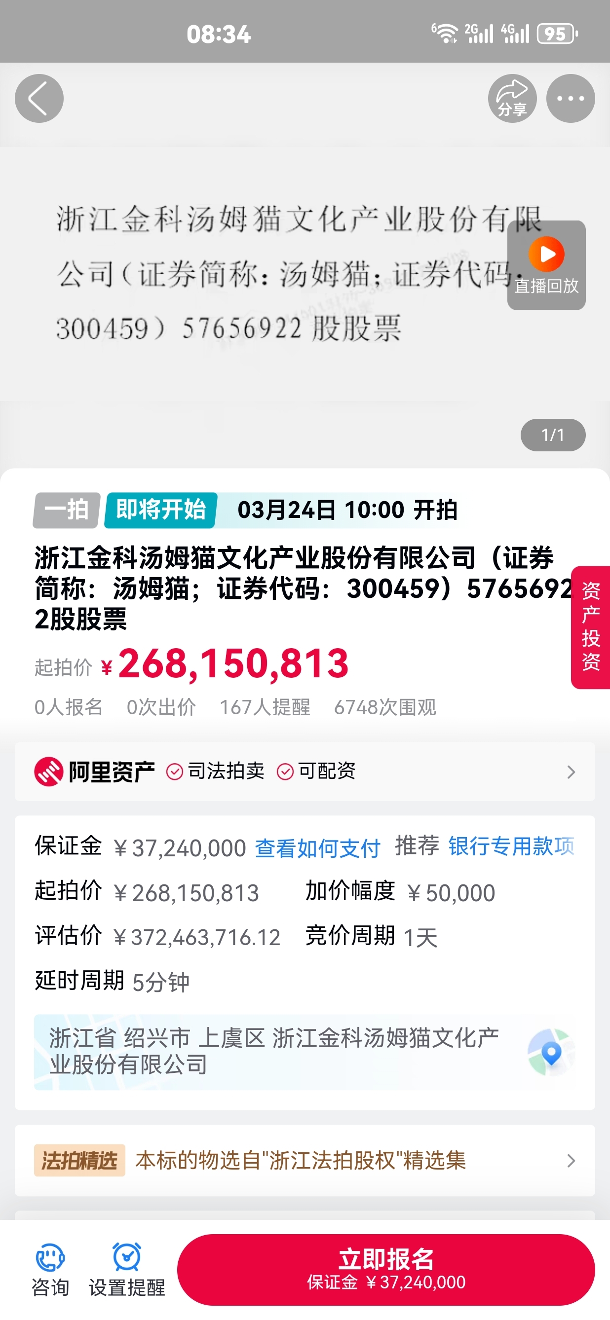 $汤姆猫(SZ300459)$ 现在的起拍价是4.65元(20日均价的70%),不会流拍,就看报名人有多少。上次只一人报名,给吴二占了大便宜。