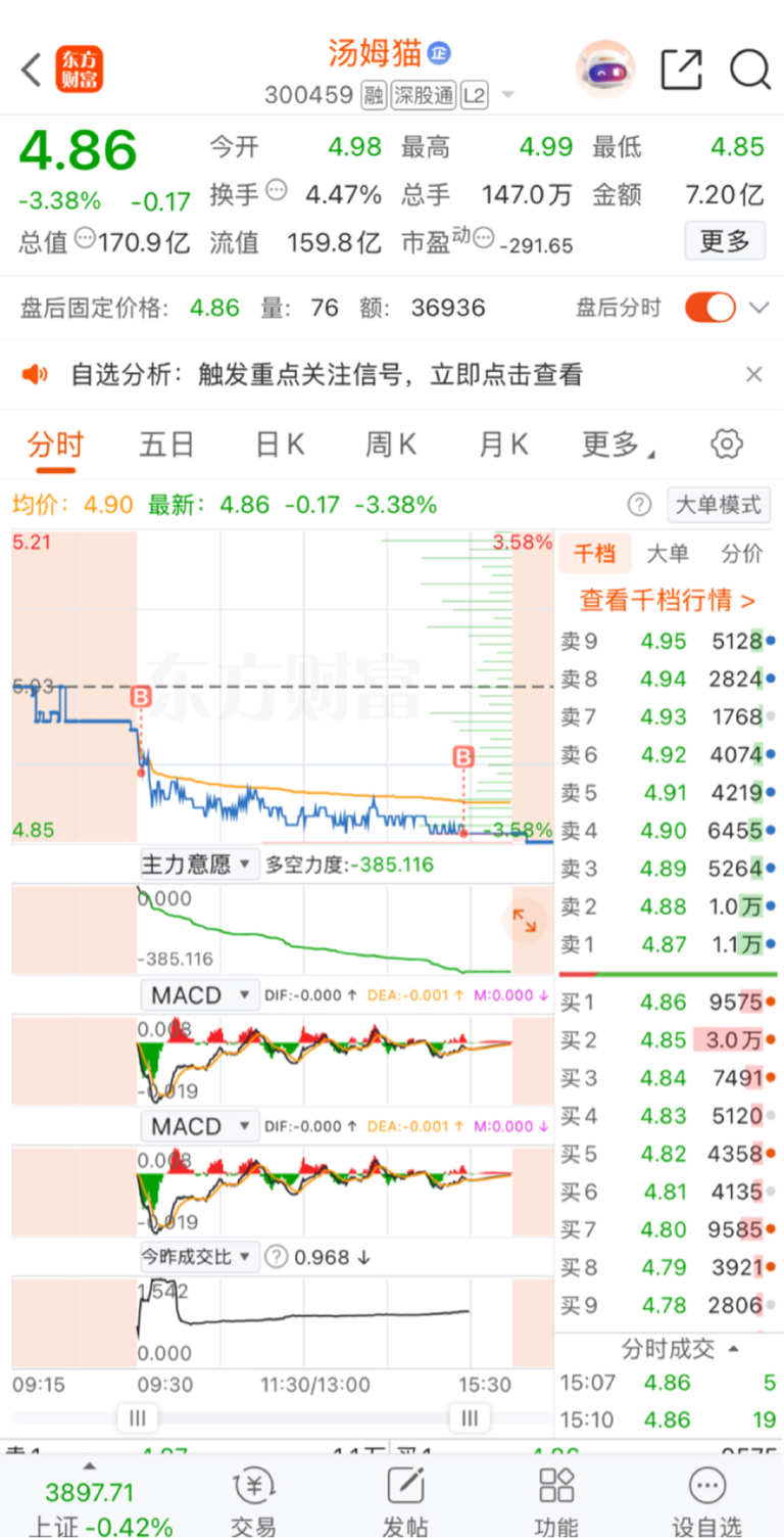 汤姆猫,昨天冲高出的今天开盘接早了,尾盘有买回了一点,明天开始做踢了。