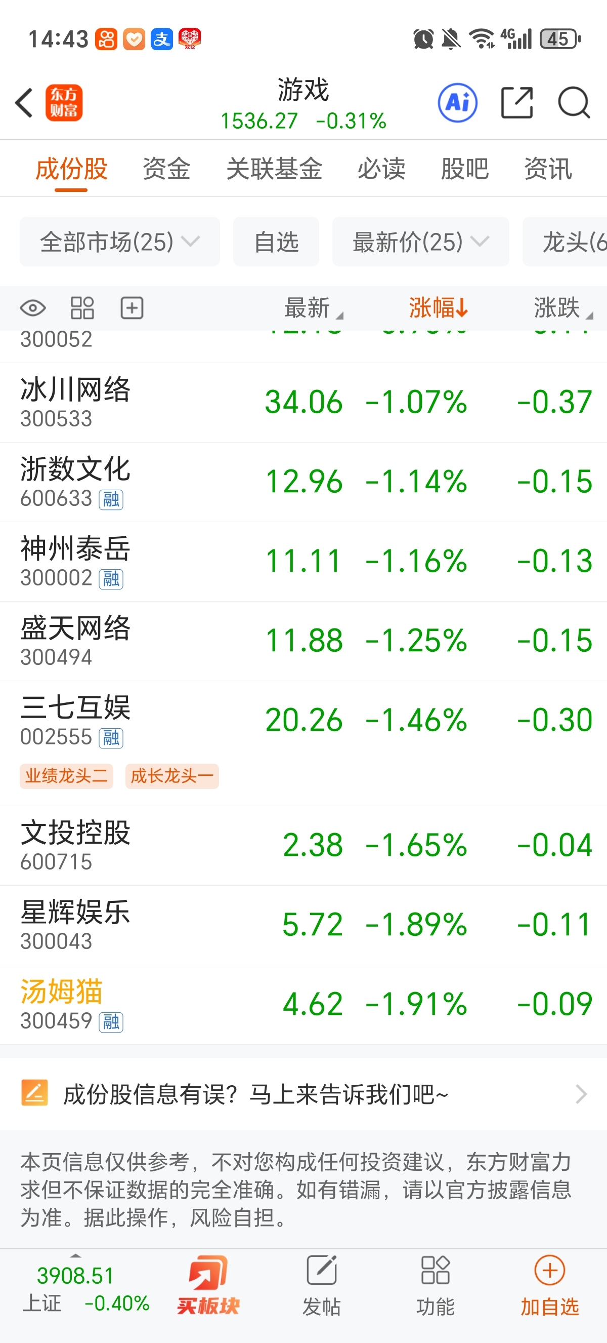 $汤姆猫(SZ300459)$ 确实牛,又是板块倒数第一