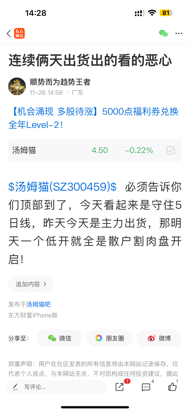 温馨提示: 1.根据《证券法》规定,禁止编造、传播虚假信息或者误导性信息,扰乱证券市场;2.用户在本社区发表的所有资料、言论等仅代表个人观点,与本网站立场无关,不对您构成任何投资建议。用户应基于自己的独立判断,自行决定证券投资并承担相应风险。《东方财富社区管理规定》