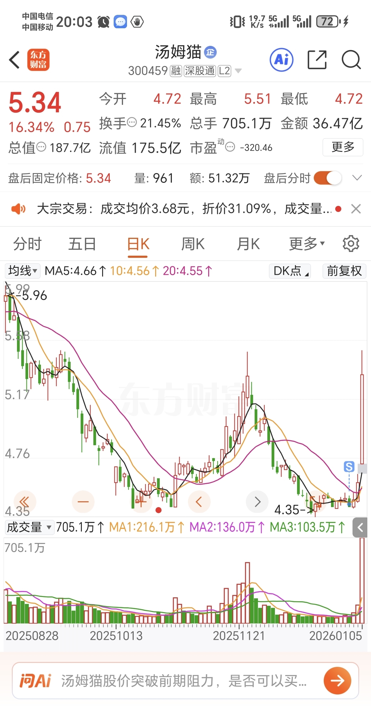 $汤姆猫(SZ300459)$ 真是没赚钱命,拿了9个月,亏1.1万走的,割肉后连续涨3天